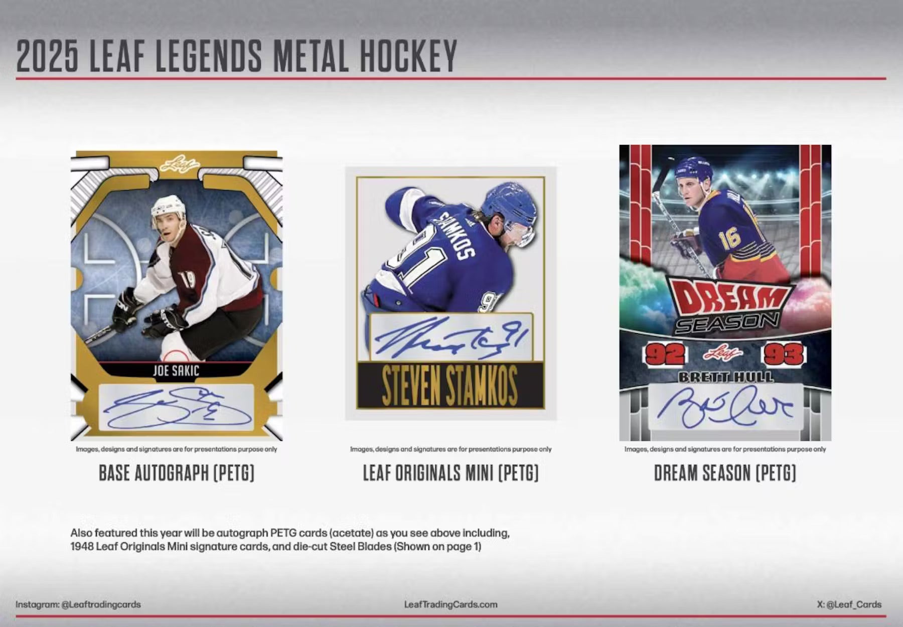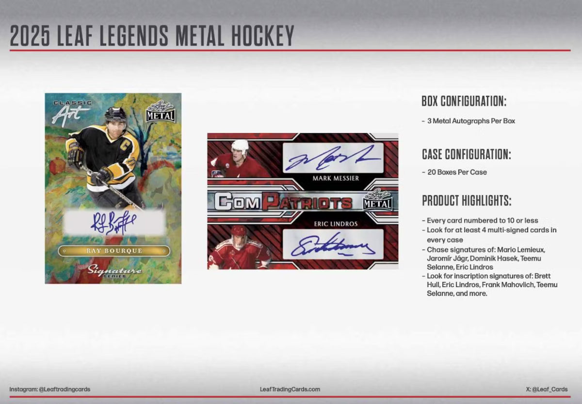 Leaf Trading Cards is excited to announce the return of Leaf Legends Metal Hockey. The 2025 edition features some new and exciting themed inserts and signatures. Look for signature legends such as Mario Lemieux, Jaromír Jágr, Dominik Hasek, Teemu Selanne, Eric Lindros, and many more. Look for the return of Metallic Inscriptions!