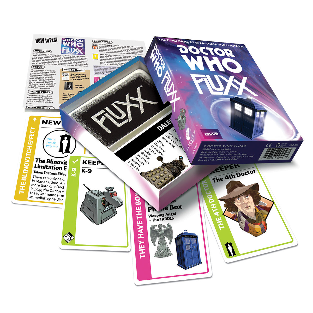 Doctor Who Fluxx takes Fluxx through Time And Relative Dimension In Space. Join with various regenerations of the Doctor, some companions, Gallifreyan tech, and K-9 (but beware of Cybermen, Daleks, Weeping Angels, and the Master) and play the most ever-changingest, timey-wimey version of Fluxx ever created. Doctor Who Fluxx: you'll play it time after time after time after time...