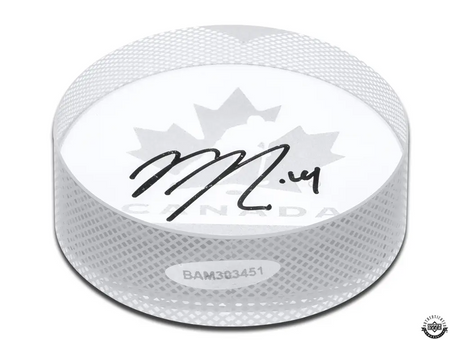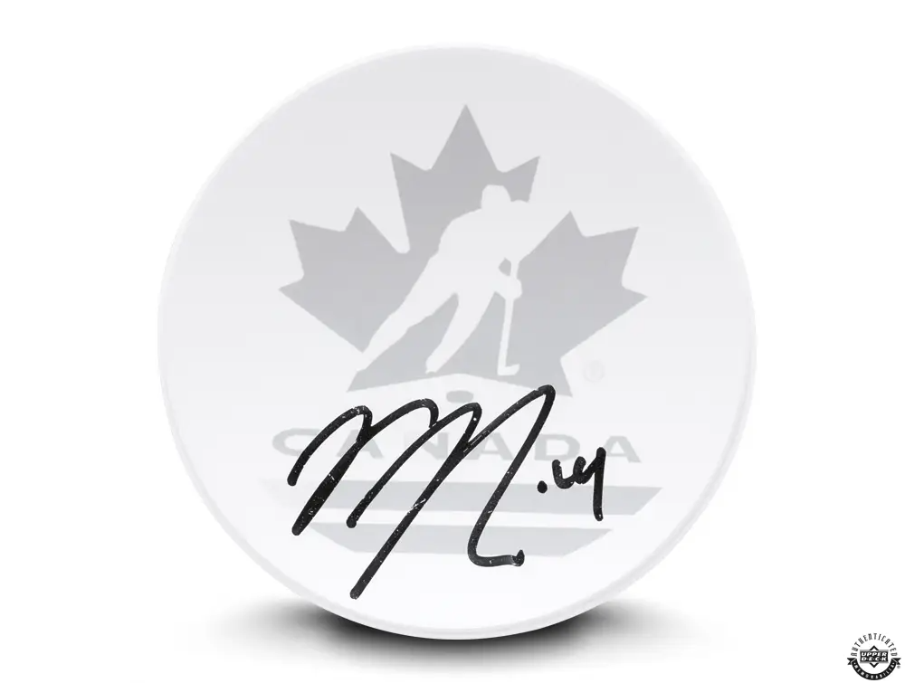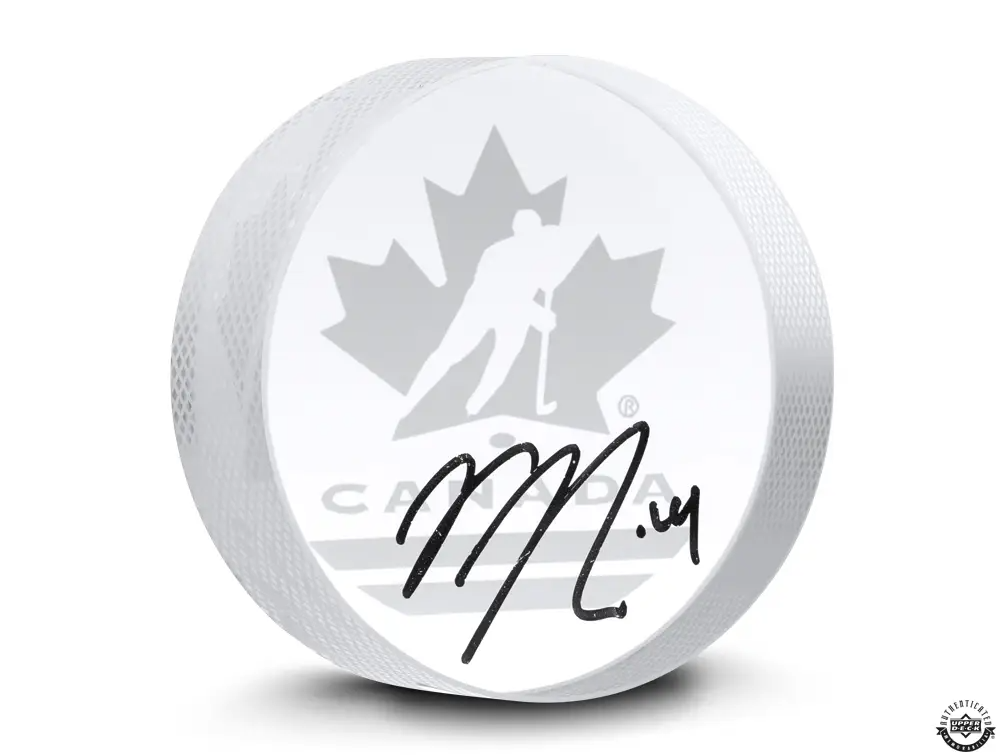This Team Canada sand carved clear crystal hockey puck is autographed by Nick Suzuki. Suzuki’s signature was witnessed by an Upper Deck representative as part of UDA’s 5-step authentication process.