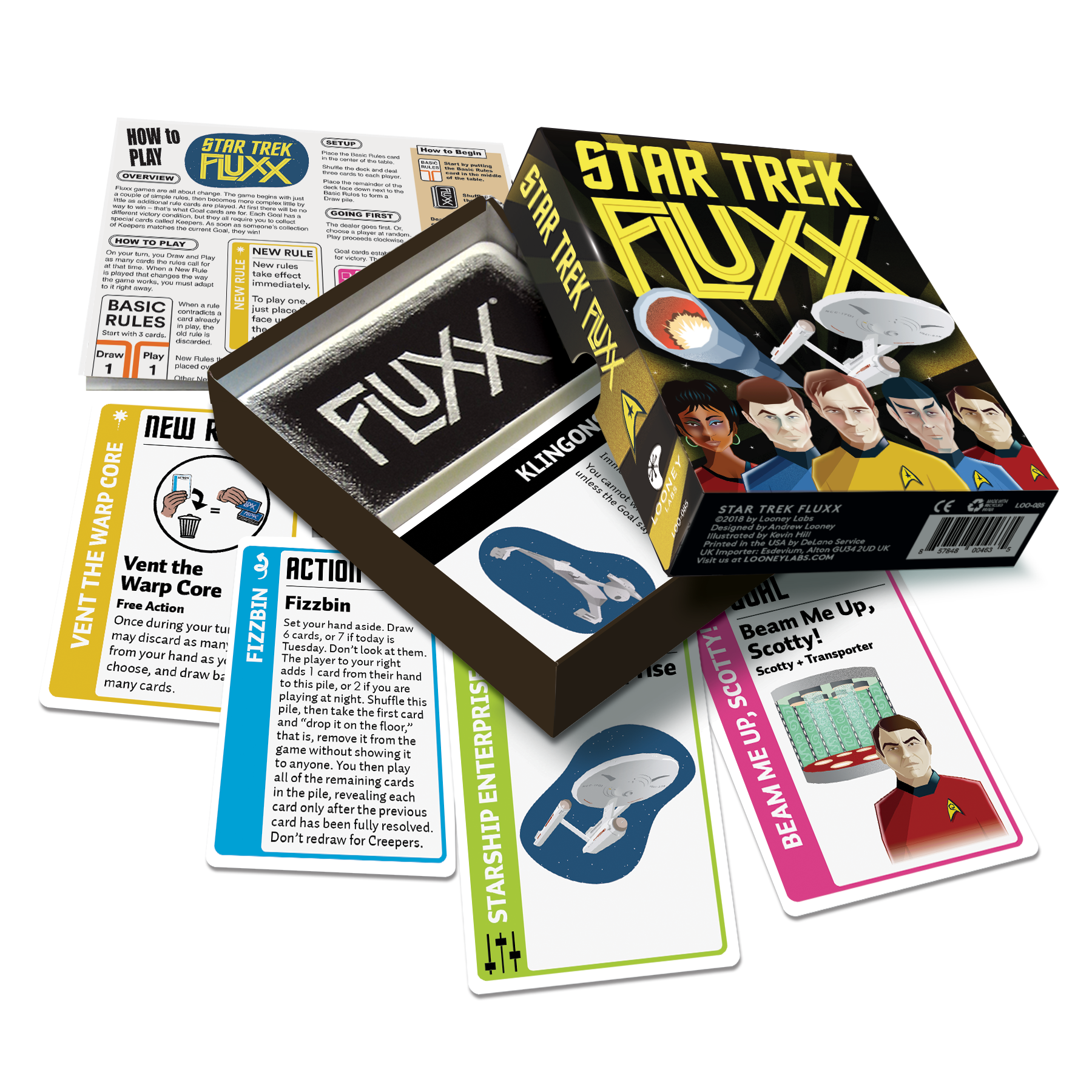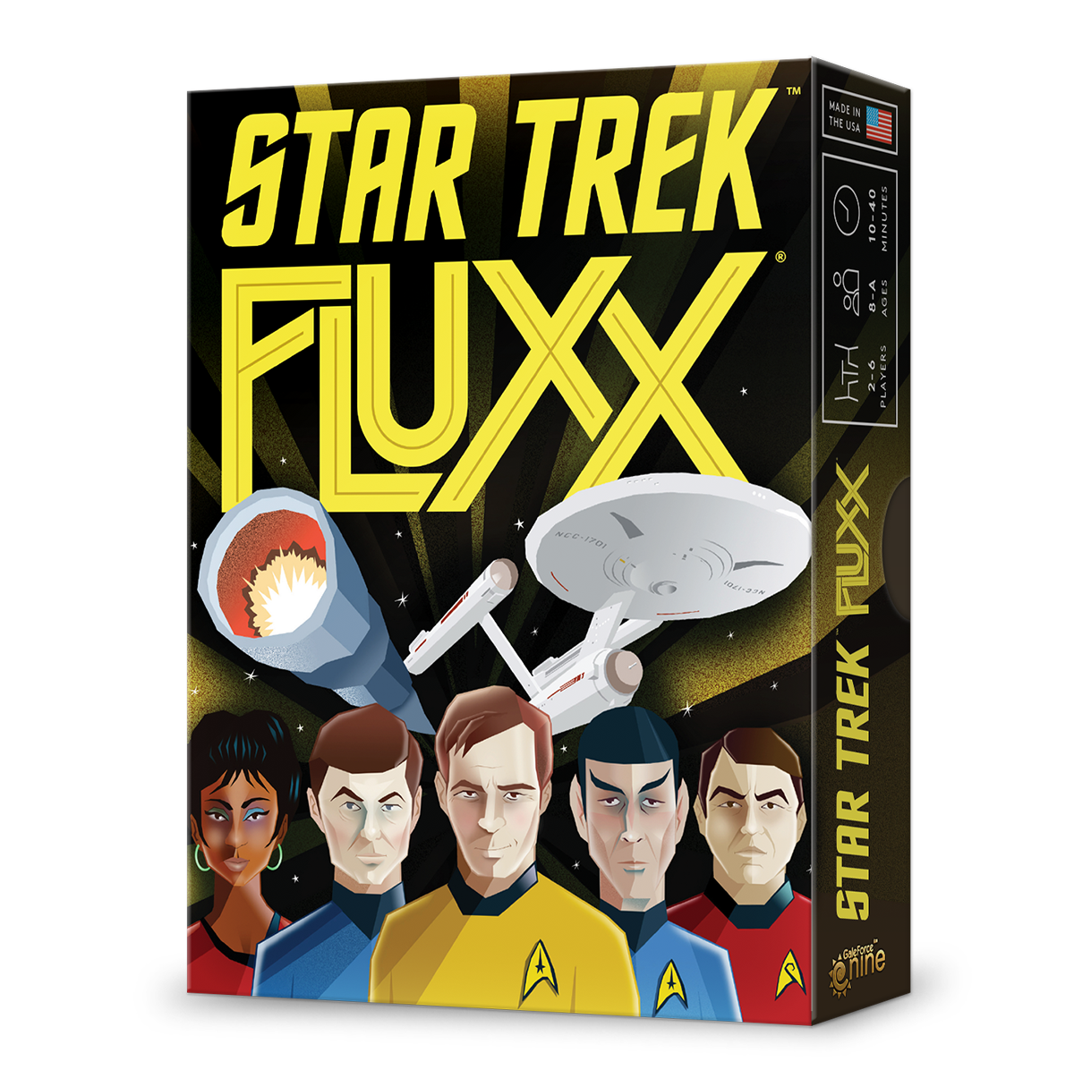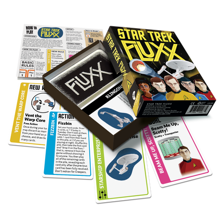 Set a course for the final frontier with Star Trek Fluxx! Featuring Kirk, Spock, McCoy, and the rest of the original series crew, you’ll take command of the Enterprise, and face Creepers like Klingons, Romulans, and the terrifying Doomsday Machine. You might even find yourself playing Fizzbin or Venting the Warp Core to explore new worlds and collect the Keepers needed for victory! Star Trek Fluxx will take you where no card game has gone before!