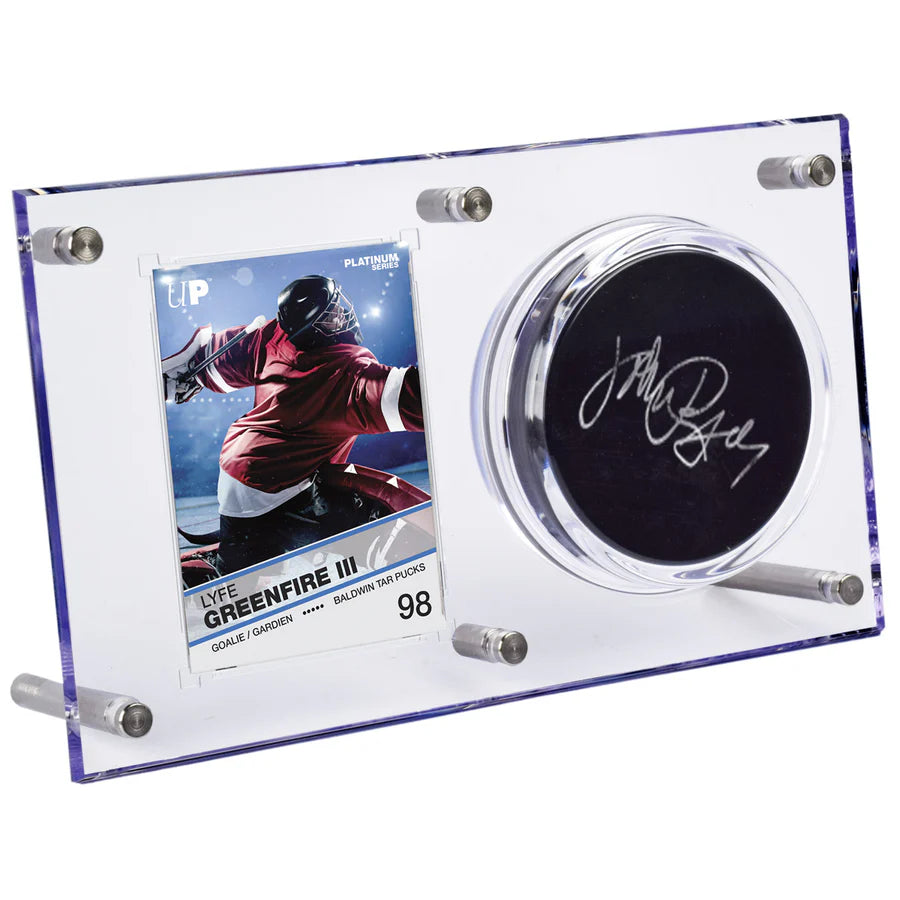 - Safely stores and displays 1 puck & 1 standard size trading card up to 120pt thickness