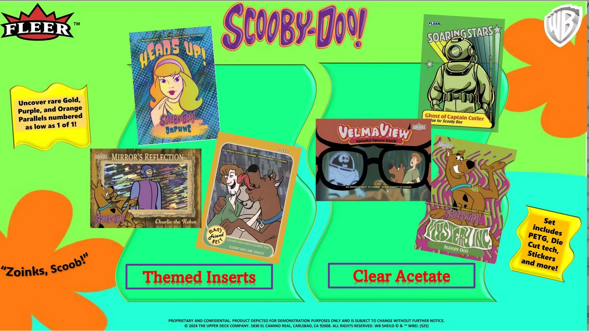Look for ultra-flashy acetate cards Velma View, Those Meddling Kids! Puzzle, and Soaring Stars along with classic Fleer designs on stunning clear acetate!