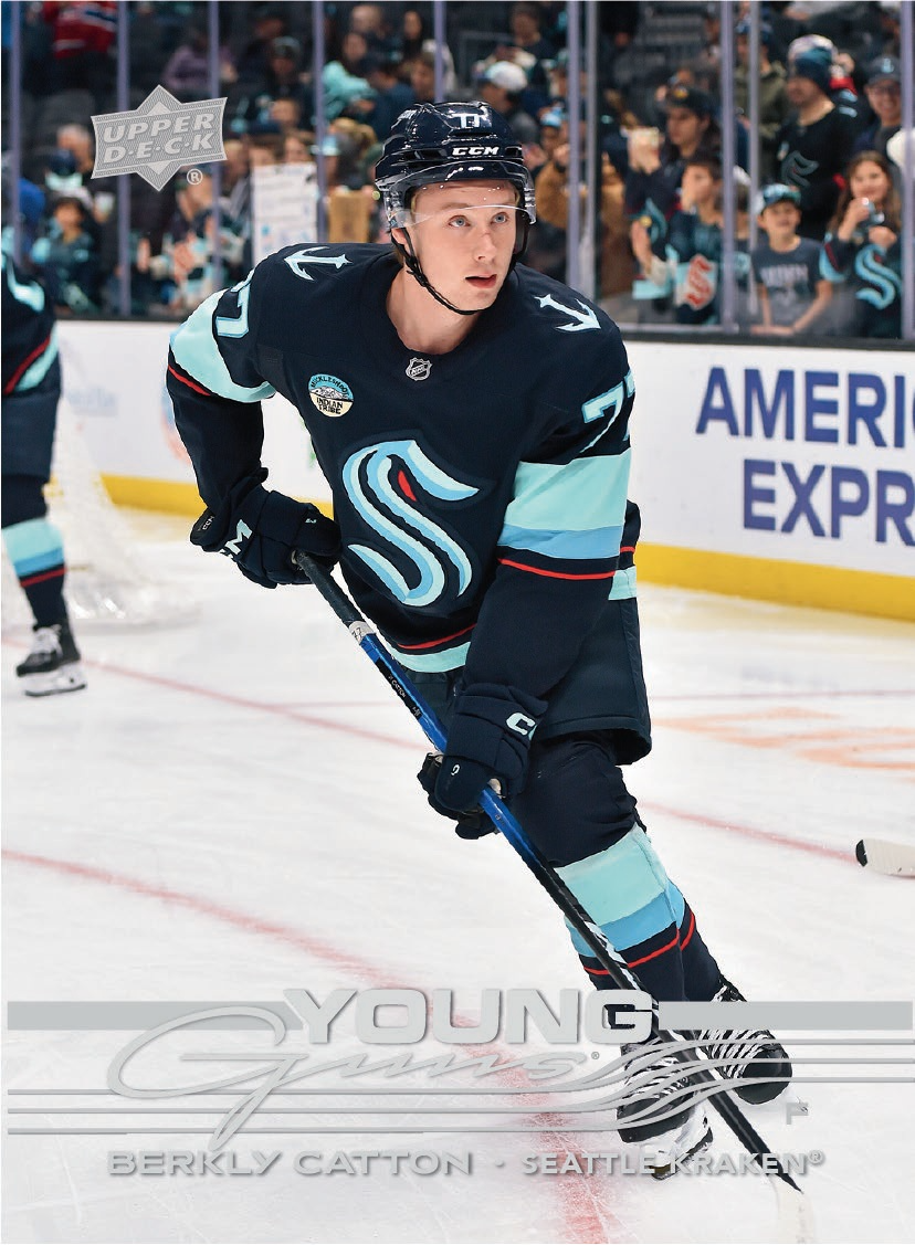 Complete your 2025-26 UD Canvas® set! In addition to the veteran cards, keep an eye out for Young Guns®, Legends and within Extended Series this year, a new subset highlighting the inaugural NHL 4 Nations Face-Off. Collect four of these cards per box on average!