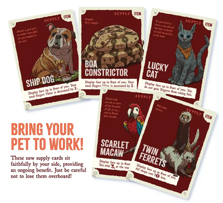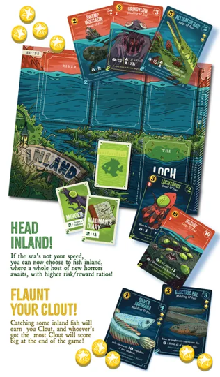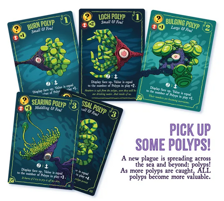 Inland, you can fish from three River shoals or one Loch shoal, both of which have a higher risk/reward ratio than the Sea. 74 new fish and 25 dinks await inland! You can also fish an entirely new sea of fish, with 117 brand-spanking new fish to discover. Mix them together with the base game fish or play with just the expansion fish, it's up to you! New polyps introduce a new mechanic: every polyp is worth more for each other polyp in play. New items and equipment are available including a new supply type: pets! Pets sit faithfully by your side and offer a persistent benefit - but they can still be lost at sea, so try not to get attached.