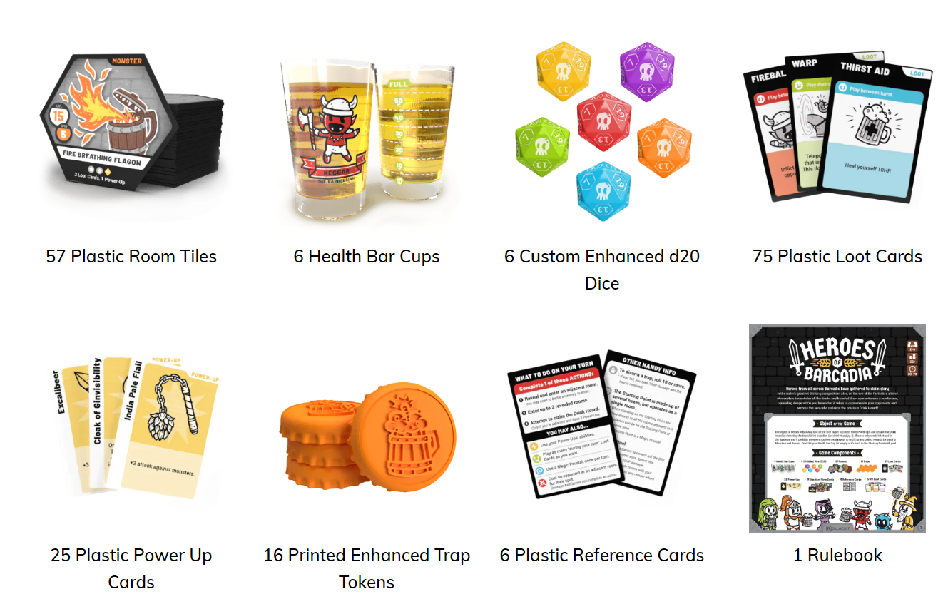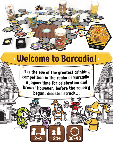 Heroes of Barcadia is a 2-6 player tile-based, dungeon-crawling tabletop party game with a liquid twist: your character’s health is measured by the drink in your glass. Heroes of Barcadia uses the Liquid Life System to determine HP, and the liquid you put in it is up to you. Will you use soda, water, alcohol, or another beverage of your choice?