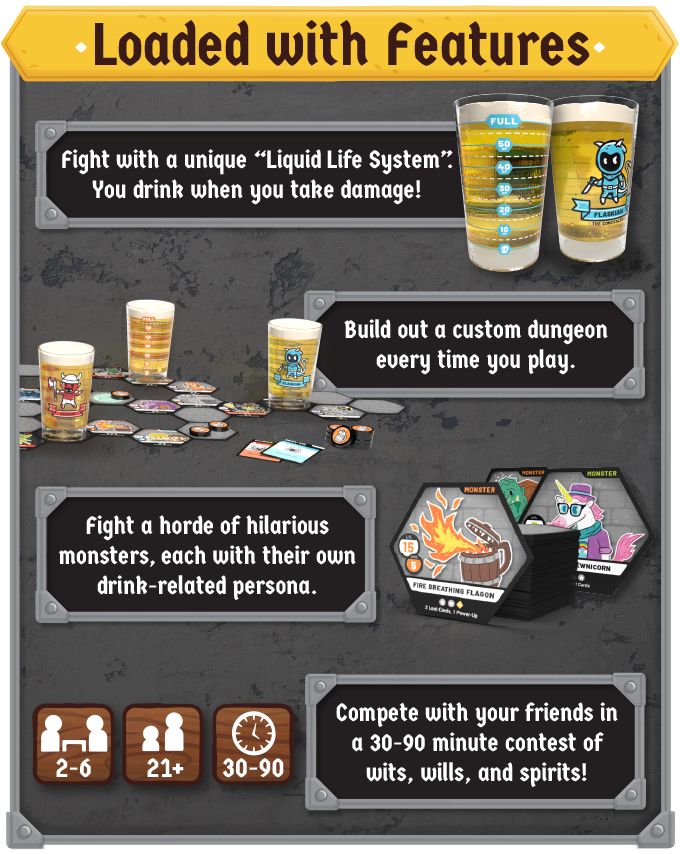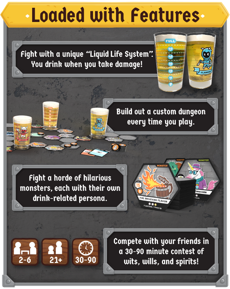 Build out your dungeon, fight monsters, collect Power-Ups to advance your character’s abilities, and use Loot Cards to stop your opponents from reaching the Grand Drink Guardian first. Nice guys finish last in this fast-paced, ever-changing, pun-tastic party game, so come ready to rum-ble and bring your thirst for adventure!