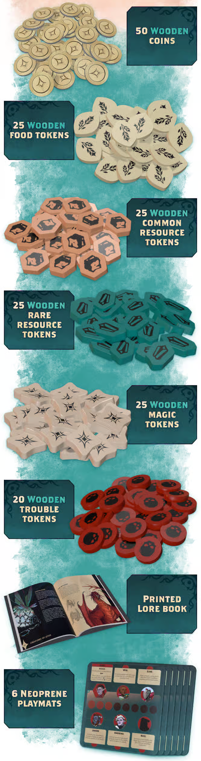 The most luxurious Kinfire Council experience possible. Bling out your game with deluxe wooden accessories, a high-grade printed lore book and six neoprene playmats for each player!