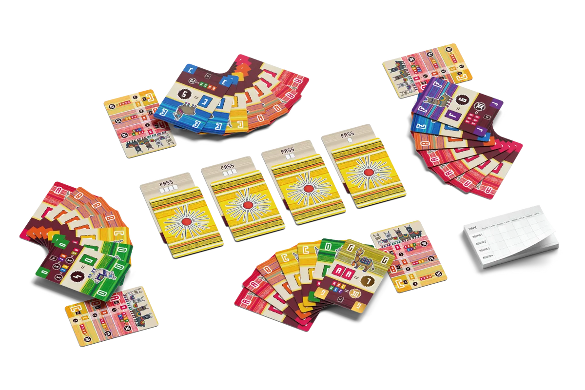 In Llama Llama, players pass cards to craft hands around the different scoring conditions. These conditions were chosen by the players secretly at the start of the round—you’ll have to try and guess at what others are going for to score big!