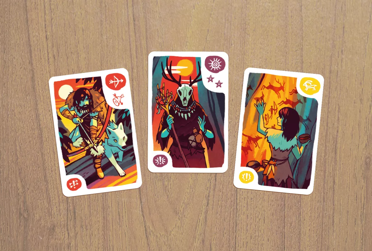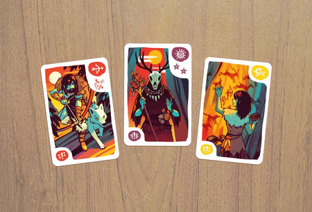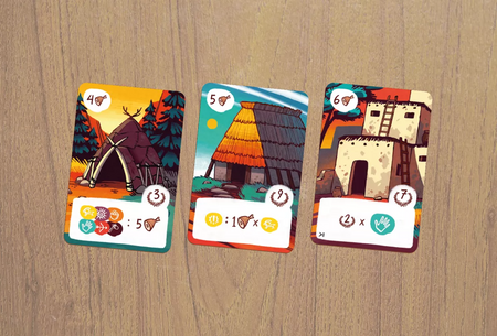 Each round, everyone places their totem on the offer track then, following the pawns’ order, will acquire character or building cards with which to grow their tribe. Each card has a specific effect and may earn prestige points as specialized buildings are constructed and players wisely face their challenges. Whoever can bring the most prestige to their tribe, wins.