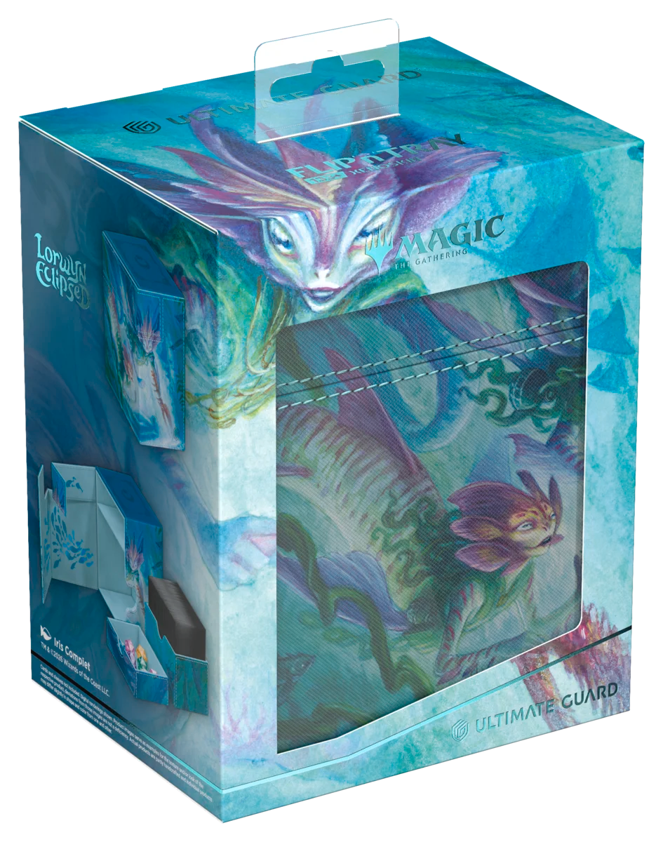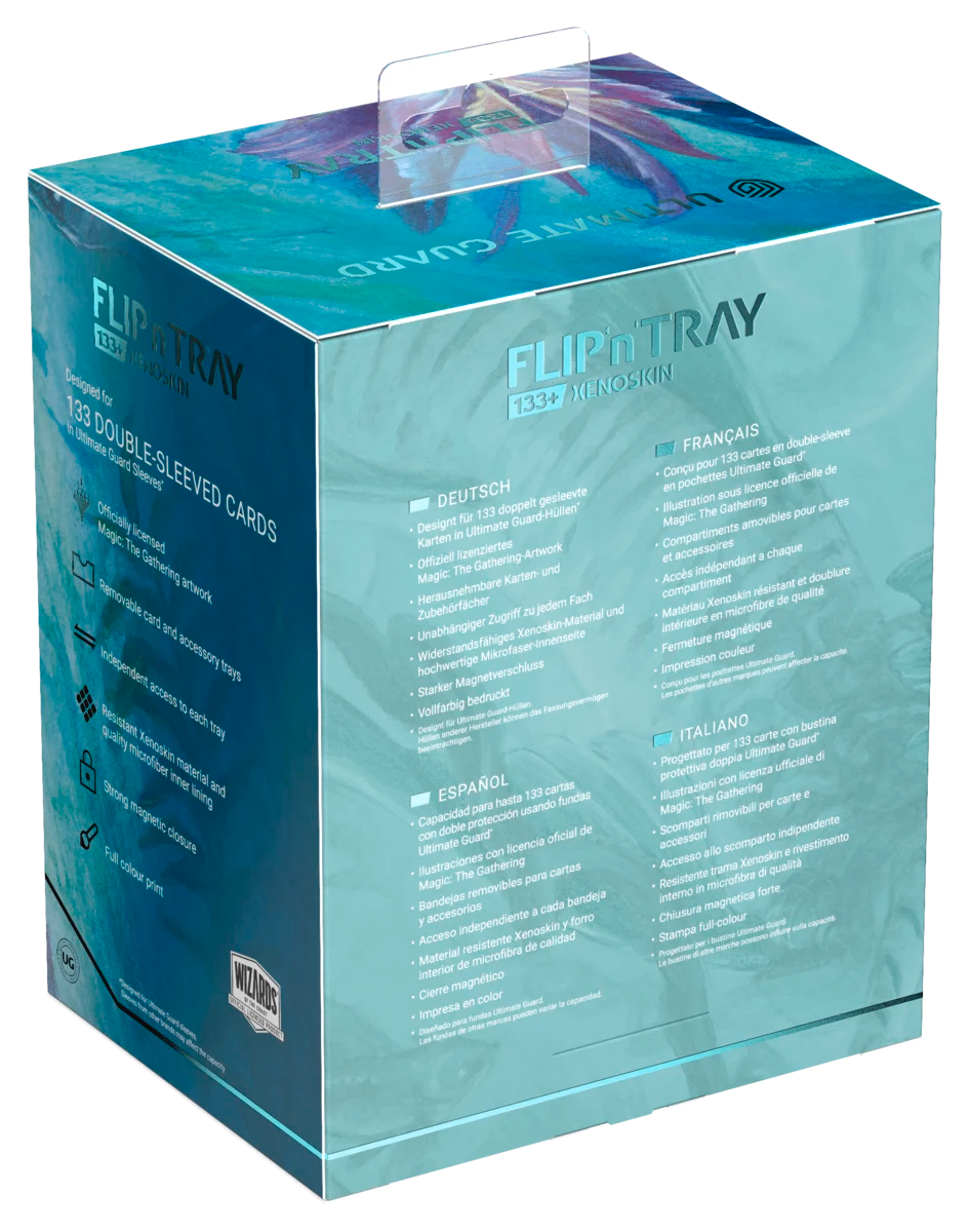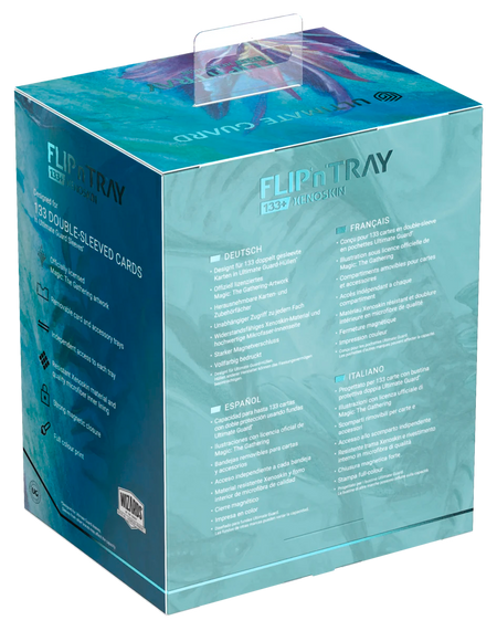 The Flip'n'Tray 133+ Xenoskin is a high-quality TCG deck box that offers premium card protection thanks to its resistant Xenoskin material, microfiber inner lining, and strong magnetic closure. The deck box has an integrated and removable accessory tray for dice that can be accessed independently and is printed in full color with officially licensed artworks from Magic: The Gathering’s upcoming set "Lorwyn Eclipsed". The Flip’n’Tray 133+ Xenoskin is optimized to hold 133 double-sleeved or 160 single-sleeved cards in Ultimate Guard sleeves.