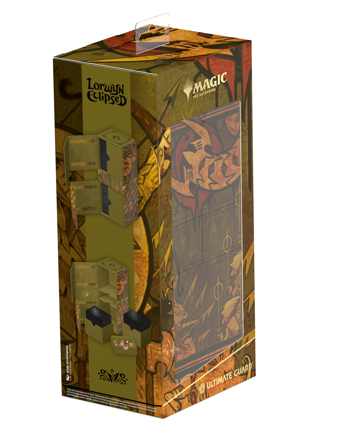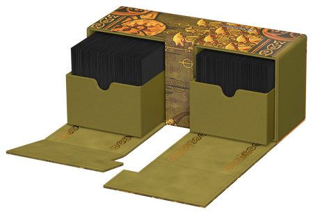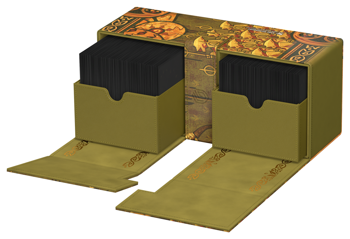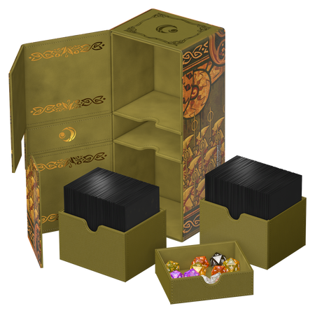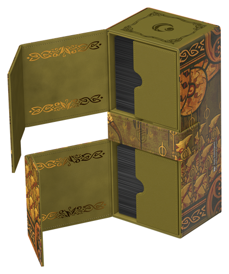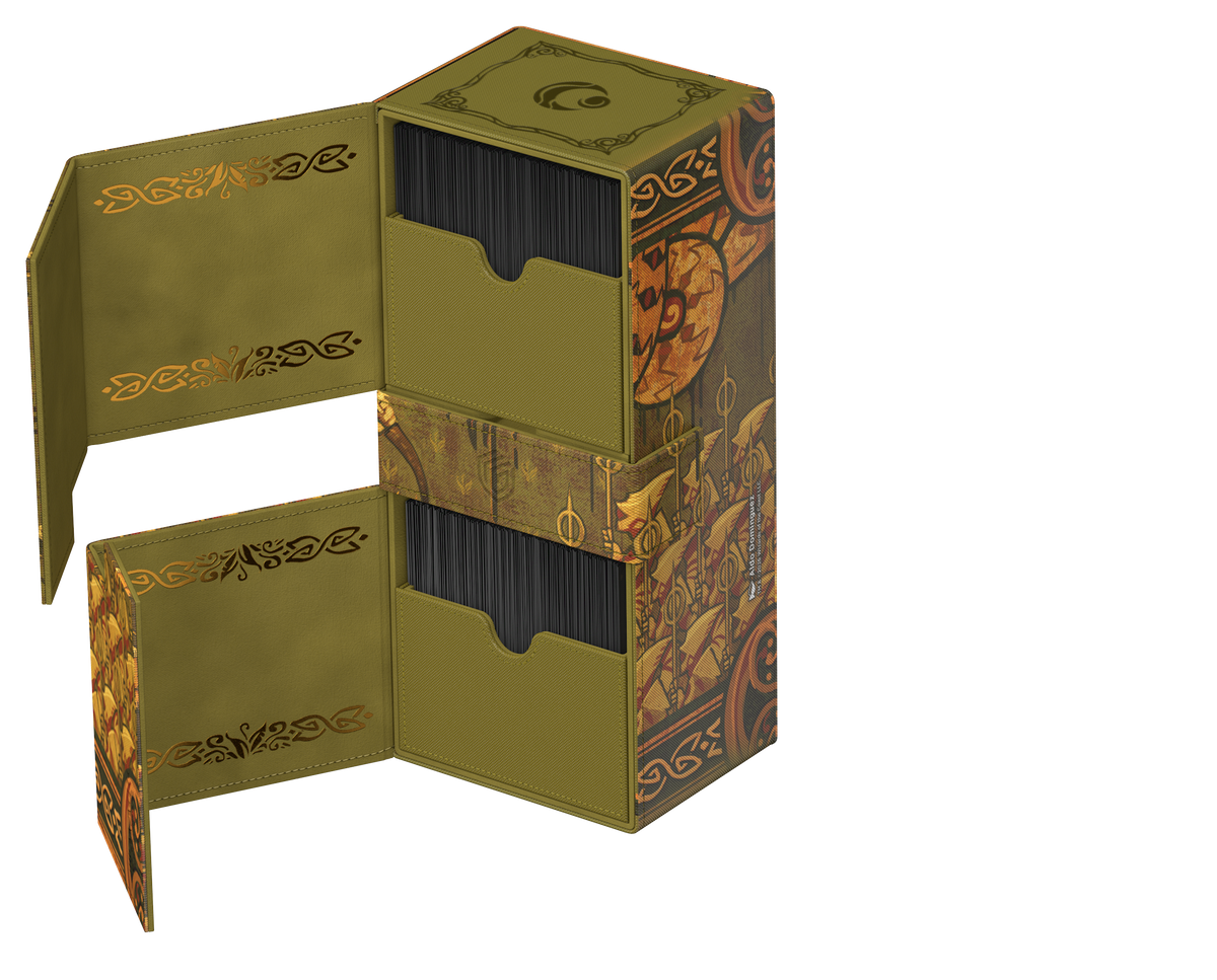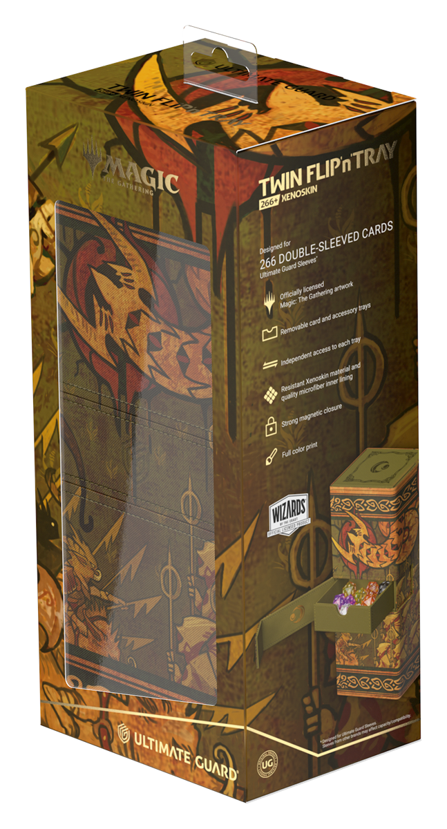 Ultimate Guard’s Twin Flip’n’Tray 266+ Xenoskin is a premium MTG deck box featuring two independently accessible compartments for 133 double-sleeved cards (in Ultimate Guard sleeves*) each, plus an additional removable tray for dice and accessories. Perfect for Magic’s Commander/EDH format, the Twin Flip’n’Tray is printed with officially licensed artwork from Magic: The Gathering’s “Lorwyn Eclipsed” set and offers extra space for additional cards and tokens. The deck box’s durable Xenoskin material, high-quality microfiber inner lining, and strong magnetic closures guarantee exceptional card protection. Designed to combine with other Ultimate Guard products, the Twin Flip’n’Tray can hold two Boulder 100+ deck boxes when the card trays are removed.