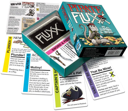 Yarr! Grab yer Cutlass! Pirates have taken over Fluxx, the ever-changing card game, and their rules be new and strange. There'll be times ye must Talk Like A Pirate, and rules about how ye can Plunder from yer mates. But the most excitin' treasure fer Fluxx fans new and old is the Surprise! - a new card type that you play out of turn! Your trusty Monkey can watch over the Gold Doubloons while you commandeer Ships on the high seas, but only Fruit can protect you from Scurvy. You'll enjoy the privileges of wearing the Captain's Hat... but watch out for Mutiny amongst the crew!