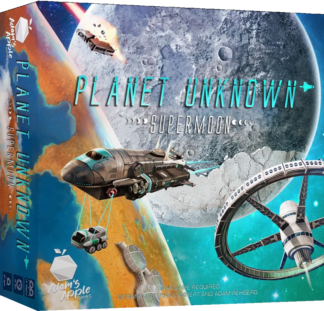 The meteor strikes have caused great damage. We’ve gathered as much wreckage as possible so please use the salvage carefully. Complete the primary objective and build the planet that will preserve humanity. Expand your developments onto the Supermoon in case the meteorite hazards get out of hand. Planet Unknown is a polyomino tile-laying game that mixes tile-placement, engine-building, simultaneous play, and resource and rover management for a unique and competitive gameplay experience. Supermoon is the first expansion.