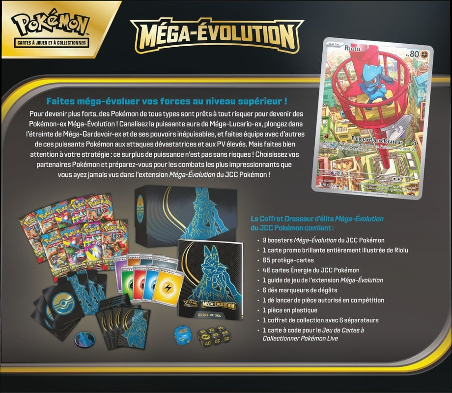 Le Coffret Dresseur d’élite Méga-Évolution du JCC Pokémon contient :