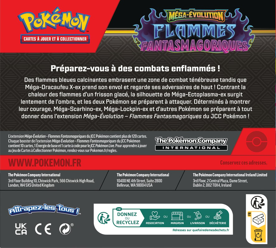 Des flammes bleues calcinantes embrasent une zone de combat ténébreuse tandis que Méga-Dracaufeu X-ex prend son envol et regarde ses adversaires de haut ! Contrant la chaleur des flammes d’un frisson glacé, la silhouette de Méga-Ectoplasma-ex surgit lentement de l’ombre, et les deux Pokémon se préparent à attaquer. Déterminés à montrer leur courage, Méga-Scarhino-ex, Méga-Lockpin-ex et d’autres Pokémon se préparent à tout donner dans l’extension Méga-Évolution - Flammes Fantasmagoriques du JCC Pokémon !