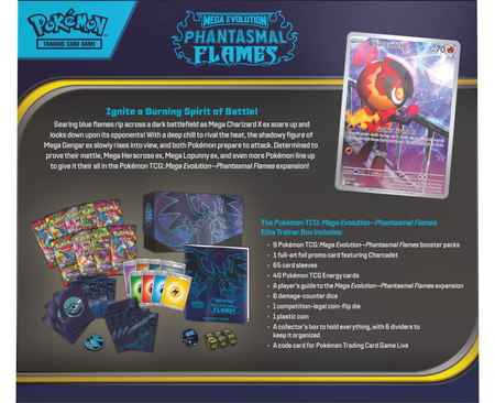 The Pokemon TCG: Mega Evolution Phantasmal Flames Elite Trainer Box includes: