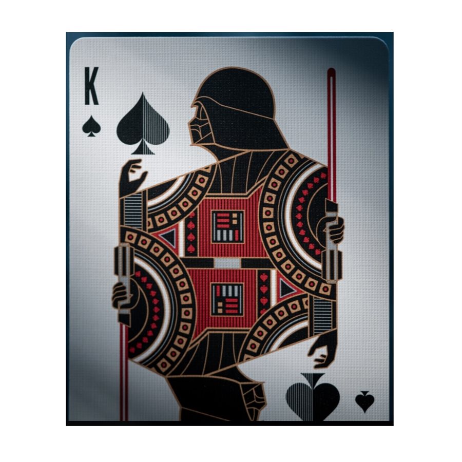 - The blue deck back design features the top of R2 D2 and the Rebel Alliance symbol. In the center, a repeating pattern of X wing starfighters supports two lightsabers on each side edge.