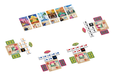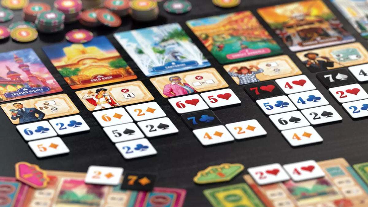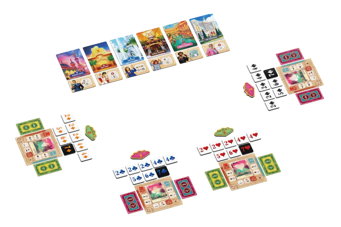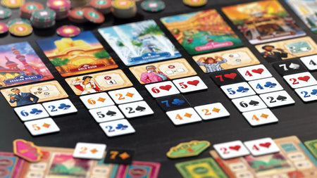 In this 2-6 player bluffing game, players have hidden information about which casinos are corrupt. Take turns playing money tiles (two 2’s, two 4’s, one 5, one six, one seven) into the different casinos.